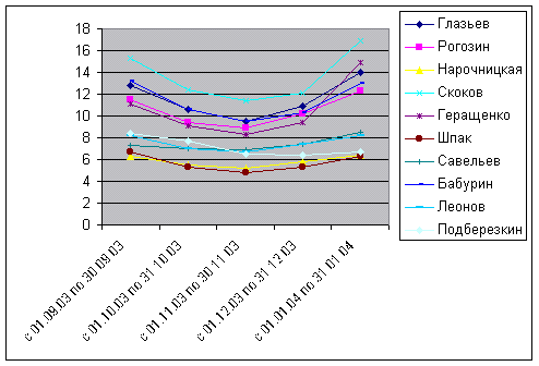 3) Обращает на себя внимание сходное поведение графиков всех политиков, представленных на диаграмме. Они имеют параболическую форму – в начале индивидуальные рейтинги всех политиков достаточно велики. Затем – в октябре-ноябре начинают согласовано опускаться, а потом, после победы на выборах вновь растут.